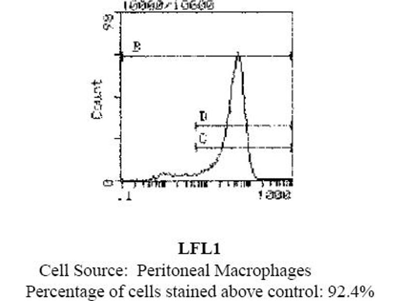 FLOW CYTOMETRY ANALYSIS: Method: 1. Prepare a cell suspension in media A. For cell preparations, deplete the red blood cellpopulation with Lympholyte®-Rat cell separation medium. 2. Wash 2 times. 3. Resuspend the cells to a concentration of 2x10e7 cells/ml in media A. Add 50µl of thissuspension to each tube (each tube will then contain 1 x 10e6 cells, representing 1 test). 4. To each tube, add 0. 2-0. 5 µg* of this Ab. 5. Vortex the tubes to ensure thorough mixing of antibody and cells. 6. Incubate the tubes for 30 minutes at 4°C. (It is recommended that the tubes areprotected from light, since most fluorochromes are light sensitive. )7. Wash 2 times at 4°C. 8. Resuspend the cell pellet in 50 µl ice cold media B. 9. Transfer to suitable tubes for flow cytometric analysis containing 15 µl of propidiumiodide at 0. 5 mg/ml in PBS. This stains dead cells by intercalating in DNA. Media: A. Phosphate buffered saline (pH 7. 2) + 5% normal serum of host species + sodium azide(100 µl of 2M sodium azide in 100 mls). B. Phosphate buffered saline (pH 7. 2) + 0. 5% Bovine serum albumin + sodium azide (100µl of 2M sodium azide in 100 mls). Results - Tissue Distribution: Rat Strain: FischerCell Concentration: 1x10e6 cells per testAntibody Concentration Used: 0. 5 µg/10e6 cellsIsotypic Control: FITC Mouse IgG1,kCell Source Percentage of cells stained above control: Thymus: 3. 0%Peritoneal Macrophages: 92. 4%Results - Strain Distribution: Antibody Concentration Used: 0. 5 mg/10e6 cellsStrains Tested: Wistar, Brown Norway, Buffalo, Fischer 344Positive: Buffalo, Brown Norway, Fischer 344, WistarNegative: none