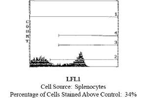 FLOW CYTOMETRY ANALYSIS: METHOD: 1. Prepare cell suspension in media A. For cell preparations, deplete the red blood cellpopulation with Lympholyte®-Rat. cell separation medium. 2. Wash 2 times. 3. Resuspend cells to 1x10e6 cells in approximately 50 µl media A in a microcentrifugetube. (i. e. 50 µl of cells resuspended to 2x10e7 cells/ml). The contents of 1 tube represent 1test. 4. To each tube add 50 µl of a 1: 250 - 1: 500 dilution of this Ab. 5. Vortex the tubes to ensure thorough mixing of antibody and cells. 6. Incubate the tubes for 30 minutes at 4°C. 7. Wash 2 times at 4°C. 8. Add 100 µl of secondary antibody (FITC Goat anti-mouse IgG (H+L)) at 1: 700 dilution. 9. Incubate tubes at 4°C for 30-60 minutes. (It is recommended that the tubes areprotected from light since most fluorochromes are light sensitive). 10. Wash 2 times at 4°C in Media B. 11. Resuspend the cell pellet in 50 µl ice cold Media B. 12. Transfer to suitable tubes for flow cytometric analysis containing 15 µl of propidiumiodide at 0. 5 mg/ml in phosphate buffered saline. (This stains dead cells by intercalatingDNA). MEDIA: A. Phosphate buffered saline (pH 7. 2) + 5% normal serum of host species + sodium azide(100 µl of 2 M sodium azide in 100 mls). B. Phosphate buffered saline (pH 7. 2) + 0. 5% bovine serum albumin + sodium azide (100 µlof 2 M sodium azide in 100 mls). RESULTS: Rat Strain: Lewis RatCell Concentration: 1x10e6 cells per testAntibody Concentration: 1: 400Isotypic Control: Mouse IgG1, κCELL SOURCE PERCENT STAININGThymus 12%Spleen 34%Lymph Node 25%STRAIN DISTRIBUTION: Antibody Concentration: 1: 100Strains Tested: Wistar, Buffalo, Brown Norway, Fischer 344Positive: Wistar, Buffalo, Brown Norway, ACI, Fischer 344Negative: none