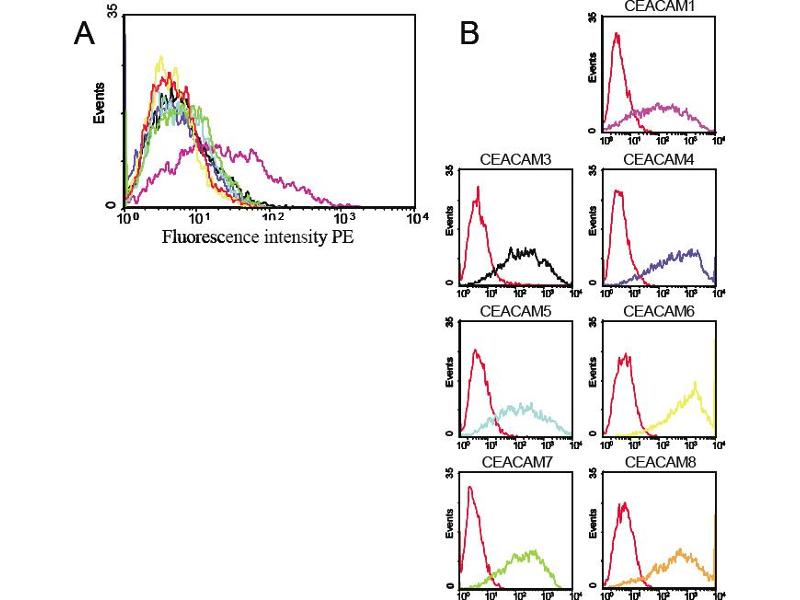 CEACAM1 (BGP/CD66a) is a transmembrane glycoprotein which belongs to the carcinoembryonic antigen (CEA) gene family (1,2). It is expressed on cells of epithelial and myeloid origin and mediates homophilic intercellular interactions that influence cellular growth, immune cell activation, and tissue morphogenesis. CEACAM1 is a putative tumour suppressor based on diminished expression in some aggressive types of cancer cells (3). The anti-tumour effect may be due to inhibition of tumour angiogenesis, possibly by increased secretion of anti-angiogenic molecules from the cells (4). Like all members of the CEACAM family, it consists of a single N domain, with structural homology to the immunoglobulin variable domains, followed by two immunoglobulin constant-like A (A1, A2) and one B domain. While the N, A1 and B domains can also be found in other CEA-family members, the A2 domain of CEACAM1 differs from those found in other CEACAM.Synonyms: BGP, BGP1, Biliary glycoprotein 1, Carcinoembryonic antigen-related cell adhesion molecule 1