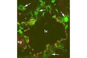 Prox-1 is a homeobox gene and acts as a master switch for lymphatic endothelial phenotype. Expression of Prox-1 in blood endothelial cells induces expression of other lymphatic marker genes. Together with Podoplanin, Prox-1 can be used to reliably distinguish lymphatic vessels from blood vessels. Prox-1 is expressed in CNS, eye, pancreas, liver and heart, and it is one of the most specific and reliable markers for lymphatic endothelial cells.Synonyms: Homeobox prospero-like protein PROX1, PROX1, Prospero homeobox protein 1