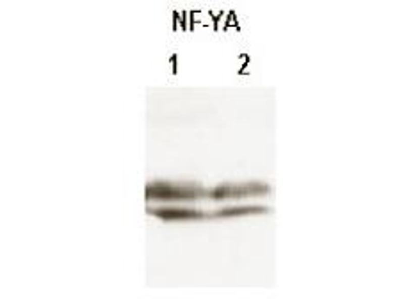 Suitable for Immunoprecipitation, Immunoblotting, ELISA and supershift assays. Recommended Dilution(s): This product was assayed by Immunoblot and found to be reactive against thedifferentially spliced 35 and 42 kDa forms of the A subunit of human and mouse NF-Y at adilution of 1: 1000 followed by reaction with Peroxidase conjugated Affinity Purifiedanti-Rabbit IgG [H&L] (Goat) (Cat#R1364HRP). No reaction was observed by immunoblotagainst the 25 kDa B subunit of NF-Y. This product was also tested in a gel supershift assay and found to be reactive againsthuman and mouse NF-Y using 2.0 μL per assay. This product was assayed against NF-Y A subunit peptide in an antibody capture ELISAusing Peroxidase conjugated Affinity Purified anti-Rabbit IgG [H&L] (Goat) (Cat#R1364HRP)and ABTS substrate. A dilution of 1: 10,000 is suggested from this experiment.