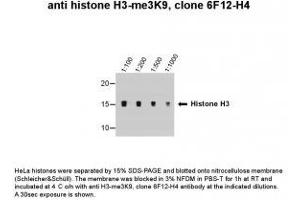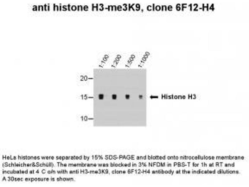 - Optimal antibody dilution should be determined by titration, however as a guideline try up to 1:1000 for western blot. Detects a band of approximately 17 kDa (predicted molecular weight: 15 kDa).Can be blocked with Histone H3 peptide - tri methyl K9