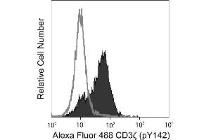 The T cell receptor (TCR), expressed by thymocytes and T lymphocytes, is a multi-component cell-surface complex responsible for recognizing antigen in the context of MHC molecules. The antigen-specific binding component of the TCR, Ti, is a heterodimer of the variable Ig-like subunits a and b or g and d. Ti is non-covalently associated with an invariant set of molecules referred to as the CD3 polypeptides, g, d, e, and zeta. The CD3 z polypeptide (CD3z) was named CD247 at the 7th Human Leukocyte Differentiation Antigens Workshop. CD3 appears early in thymocyte differentiation and remains expressed on all mature T lymphocytes. After antigen recognition by the TCR, CD3z is the primary intracellular signal transducing subunit. It contains three ITAMs (Immunoreceptor Tyrosine-based Activation Motifs), each of which contains a pair of tyrosine residues that are phosphorylated by Lck and Fyn and are required for signal propagation. The molecular weight of CD3z is 16 kDa, and it is also observed as 32-kDa homodimers or as heterodimers with the g chain of Fc receptors. Upon phosphorylation, the CD3z monomer undergoes an apparent shift in electrophoretic mobility up to 21 kDa. The K25-407.69 monoclonal antibody recognizes the phosphorylated tyrosine 142 (pY142) in the third ITAM domain of human CD3z (CD247). Synonyms: CD3zeta