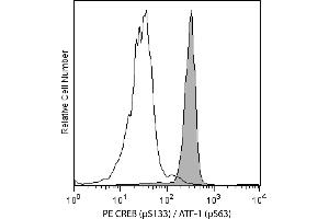 Transcription of various genes is regulated by the cyclic AMP (cAMP) signal transduction pathway through a family of cAMP Responsive Element (CRE)-Binding transcription factors that include CREB, CREM (CRE Modulator), and ATF-1 (Activating Transcription Factor 1). The genes for these transcription factors encode multiple isoforms that are created by alternative splicing, alternative initiation codons, and alternative intronic promoters. Homo- and heterodimers of these members of the basic domain-and-leucine zipper superfamily of proteins bind the palindromic TGACGTCA sequence of CRE. CREB is expressed in all somatic cells, and many different stimuli activate CREB by phosphorylation of its serine 133 (S133). The transcriptional activity and specificity of CREB are regulated by the signaling pathways initiated by the various stimuli. Transcriptional regulation by CREB family members has been implicated in many physiological responses to extracellular and environmental stimuli, such as memory, tissue growth and development, and homeostasis. The J151-21 monoclonal antibody recognizes the phosphorylated S133 of human CREB in addition to cross-reacting with S63 of human ATF-1.