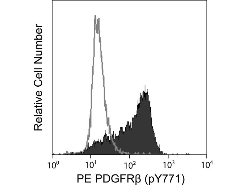 Platelet-derived growth factor (PDGF) is a potent mitogen for cells of mesenchymal origin and exerts its effects by binding to the PDGF receptor (PDGFR), a transmembrane protein tyrosine kinase. PDGFR is composed of PDGFRalpha (CD140a) and/or PDGFRbeta (CD140b) polypeptides. Both PDGF and PDGFR consist of subunits that form homo- or heterodimers with varying specificities: PDGF-AA binds only to alphaalpha PDGFR, PDGF-AB binds to both alphaalpha and alphabeta PDGFR, and PDGF-BB binds to all three PDGFRs. Ligand binding induces dimerization and activation of the receptor. Upon activation, CD140b is phosphorylated at multiple tyrosine sites and, in turn, an intracellular phosphorylation cascade is initiated. PDGFR localizes primarily to membrane invaginations termed caveolae, compartments that are enriched in several of its downstream effectors, including phosphatidylinositol 3'-kinase, Src, and phospholipase C-gamma. The J23-1044 monoclonal antibody recognizes the phosphorylated tyrosine 771 (pY771) in the kinase insert domain of CD140b. pY771 interacts with GTPase-activating protein, a negative regulator of Ras, and weakly with Shc, which indirectly promotes the activation of Ras.