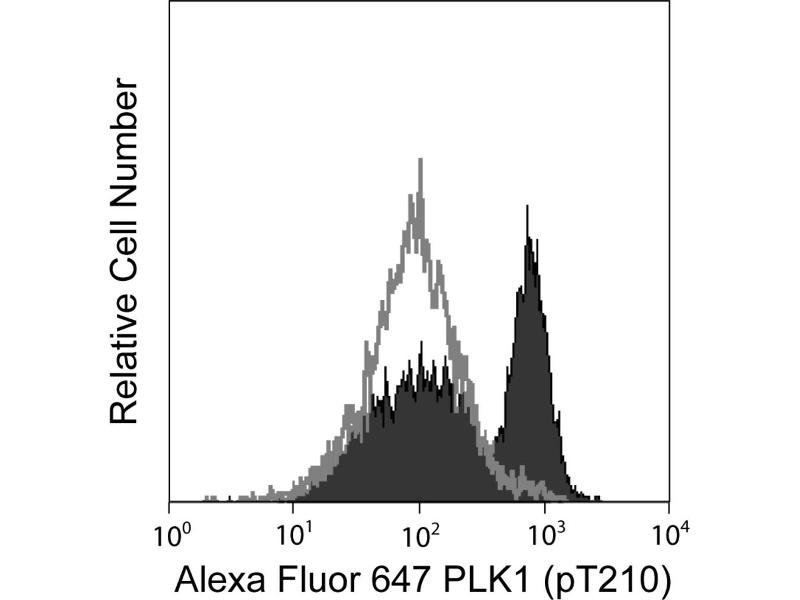 Polo-like kinase (PLK1) is a serine/threonine kinase with structural similarities to Drosophila's Polo kinase and the Cdc5p of Saccharomyces cerevisiae. Like its invertebrate counterparts, PLK1 activity is required for DNA synthesis and is regulated throughout the cell cycle. Furthermore, PLK1 is highly expressed in primary tumors. It associates with the mitotic spindle during mitosis suggesting that, in addition to its role during S phase, PLK1 may play a role during chromosome segregation. This is consistent with its potential role in cancer development. Threonine 210 (T210) is one of the major phoshorylation sites in activated PLK1 obtained from human mitotic cells. The K50-483 monoclonal antibody recognizes the phosphorylated T210 of human PLK1.
