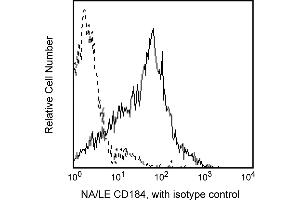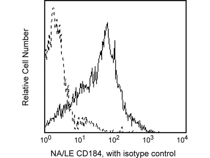 Flow cytometry: Chemokine receptors are known to internalize during manipulation resulting in low frequency expression. Investigators are advised to perform immunophenotyping studies of chemokine receptors on freshly collected samples (<24 Hrs). Incubation with the antibody should be done at 4°C in the dark. Cellular manipulation, such as Ficoll separation, freezing, or exposure to cold temperatures prior to staining should be minimized and have been shown to cause a decrease in staining intensity and/or inconsistent results. Investigators should note that alternative staining procedures may be neccessary. A multiple-step staining procedure is strongly recommended, in some instances, to amplify immunofluorescent signals for the flow cytometric analysis of human CXCR4 expression. Investigators may find the Purified NA/LE Mouse Anti-Human CD184 antibody to be useful in conjunction with appropriate secondary and tertiary reagents for detecting low frequency expression, such as with Biotin Goat Anti-Mouse Ig (MN 553999) and PE Streptavidin (MN 554061).