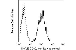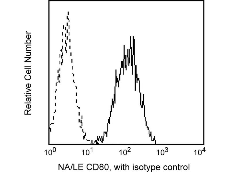 The L307.4 monoclonal antibody specifically reacts with B7/BB1, a 60 kDa transmembrane glycoprotein which was clustered as CD80 in the Fifth International Workshop on Human Leukocyte Differentiation Antigens. CD80, a member of the Ig supergene family, is expressed on activated B cells, macrophages, and dendritic cells. It is the ligand for two molecules expressed on T cells, CD28 and CD152 (CTLA-4). CD80 is also expressed on activated CD4-positive and CD8-positive T cells, appearing late after activation suggesting that activated T cells may be capable of autocrine costimulation via the CD28 activation pathway. The binding of CD28 by anti-CD28 or by CD80 results in T-cell activation and a signal for IL-2 production.