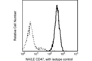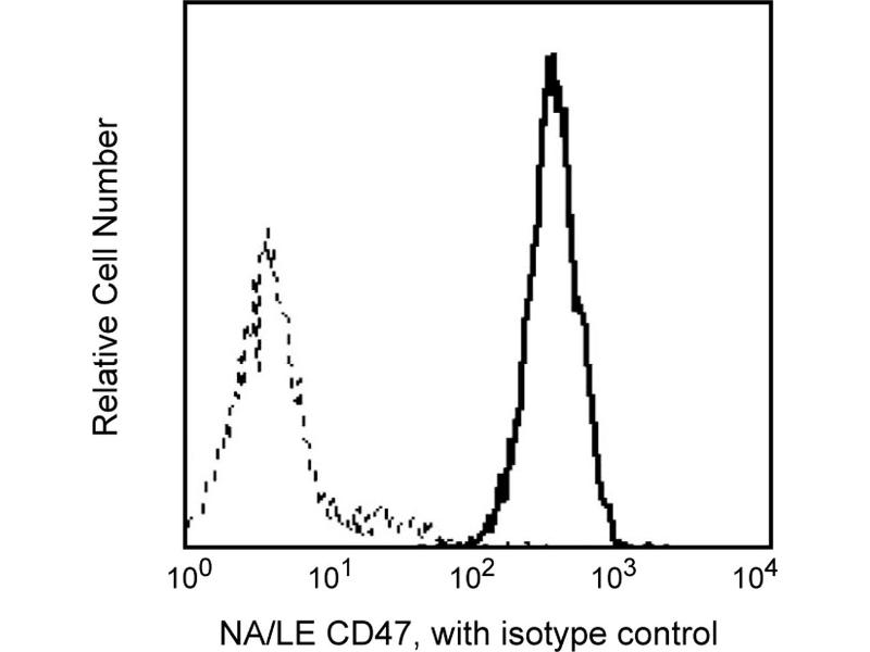 The B6H12 monoclonal antibody specifically binds to a 42-52 kDa N-linked glycan protein. CD47 antigen, also known as integrin-associated protein (IAP), is expressed on all hematopoietic cells, including leukocytes, platelets and erythrocytes. It is also expressed on epithelial cells, endothelial cells, fibroblasts and many tumor cell lines. CD47 may play a role as a signal transducer in the regulation of cation fluxes across cell membranes and in the chemotactic and adhesive interactions of leukocytes with endothelial cells. The B6H12 antibody is capable of blocking phagocytosis of microparticles by peripheral blood granulocytes. It has also been reported to induce proliferation of CD3-activated T cells.
