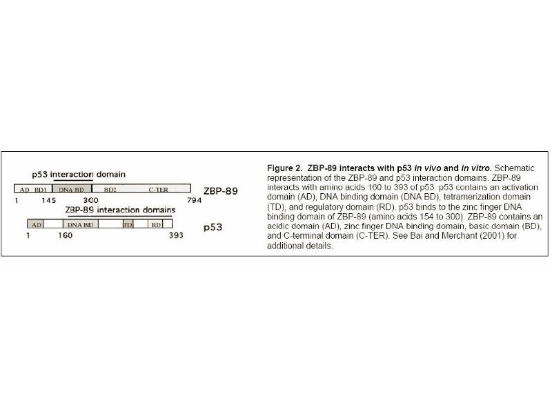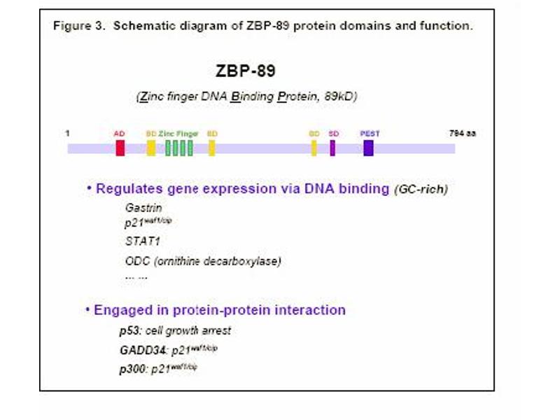 The GI tract abundantly expresses growth factors many of which bind and activate the EGF receptor present on mucosal cells. One such factor is the zinc finger protein (ZBP-89) that binds to a GC-rich DNA element in the gastrin promoter and confers EGF responsiveness. The fulllength protein functions as a repressor of growth factor signals regulating the gastrin promoter. Several other growth related promoters are also regulated by ZBP-89. ZBP-89 is one of a family of related transcriptional regulators. It has been reported in recent studies that ZBP-89 regulates growth in part by stimulating the cyclin-dependent kinase inhibitor, p21waf1, in a butyrate-dependent manner through recruitment of the histone acetyl transferase p300. Moreover, ZBP-89 triggers growth arrest in a p53-dependent manner by preventing nuclear export of p53. ZBP-89 also induces apoptosis, but this process occurs independent of p53.Synonyms: Transcription factor ZBP-89, ZBP89, Zinc finger DNA-binding protein 89, Zinc finger protein 148