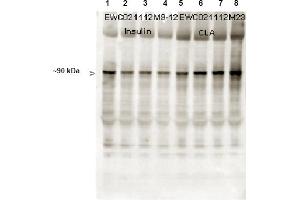 This phospho specific polyclonal antibody was tested by Immunoblotting and ELISA. By ELISA the antibody was found to be reactive with the phosphorylated form of theimmunizing peptide and minimally reactive with the non-phosphorylated form of theimmunizing peptide. Immunoblotting will detect human and mouse muscle glycogensynthase. Although not tested, this antibody is likely functional in Immunohistochemistryand Immunoprecipitation. This product has been assayed against 0.1 g of phosphorylatedpeptide in a standard capture ELISA using TMB (3,3',5,5'-Tetramethylbenizidine) as asubstrate for 30 minutes at room temperature. A working dilution of 1: 30,000 to 1: 150,000is suggested for this product. Less than 0.2 % cross-reactivity was detected against thenon-phosphorylated form o f the immunizing peptide. Dilute the antibody 1: 1,000 for
