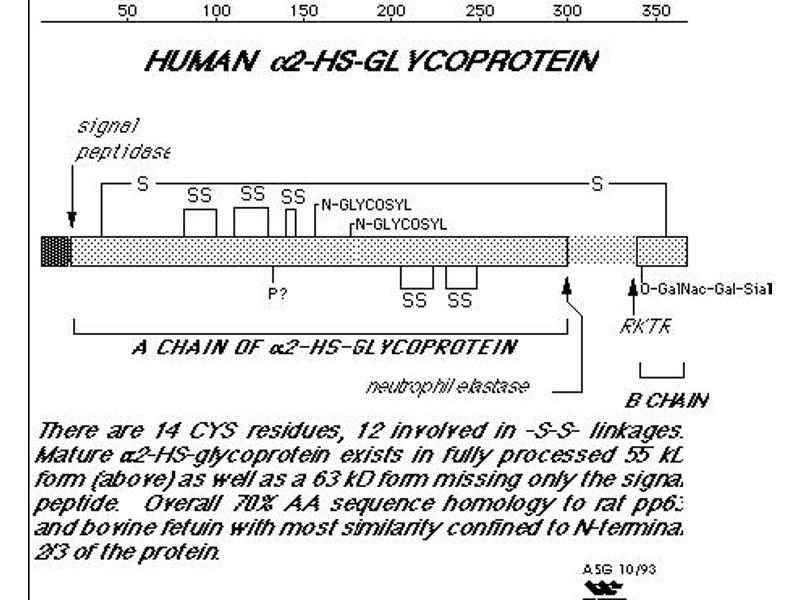 Human Fetuin (2-Heremans-Schmid-glycoprotein or α2-HS-glycoprotein) is a major plasma glycoprotein predominantly synthesized in the liver. Human fetuin is named after its bovine homolog. Fetuins are found in most mammals. Human fetuin is a negative acute-phase protein, normal circulating levels in adults (300-600 μg/mL) fall significantly (30-50 % ) during injury and infection. The biological role of fetuin is unknown, although it has been implicated as an immunomodulator that can participate in stimulation of bacterial phagocytosis by neutrophils and promotion of endocytosis by mouse macrophages. Hepatocytes are the principal cell source of circulating fetuin, but it also is expressed by monocyte/macrophages. Fetuins occur in large amounts in blood and cerebrospinal fluid and accumulate to high concentrations in calcified bone. The fetuin promoter region has several potential interleukin 6-responsive elements, and its synthesis is down-regulated during injury and inflammation. Fetuin is an acidic glycoprotein with three Nlinked and three O-linked oligosaccharide chains, whose terminal sugar residues are rich in sialic acid (Nacetylneuraminic acid), contributing to its net negative charge. A role for fetuin as a carrier of bioactive molecules has been proposed based on observations that it binds and carries Ca2+ ion. Fetuin is implicated in bone remodeling, immune function and may play a role in tumor progression of certain cell types. Fetuin plays a role as an anti-inflammatory agent by suppressing the release of TNF from stimulated macrophages. Fetuin also interacts with members of the matrix metalloprotease family of zinc dependent secreted transmembrane proteins that degrade basement membranes and extracellular matrix components. The biological activity of fetuin is mediated through its direct interaction with other proteins. Fetuin down-regulates a number of receptor tyrosine kinase family members. A motif within fetuin has homology to the TGF-β receptor type II. Circulating human plasma fetuin is partly phosphorylated which implies that phosphorylated fetuin may have a physiological function in vivo. Human fetuin isolated from plasma is a two-chain molecule consisting of a A-chain of 322 amino acid residues (53 kDa) and a B-chain of 27 residues (5 kDa). The carboxy terminal 40 amino acids of the A chain constitute a bridging peptide that may be removed proteolytically in vivo. A single mRNA encodes both the A and B chains. The apparent molecular weight of intact human fetuin is 58 kDa.Synonyms: AHSG, Alpha-2-Z-globulin, Ba-alpha-2-glycoprotein, FETUA, Fetuin A, PRO2743