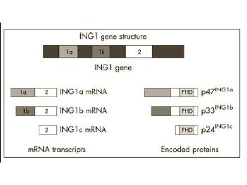 P33 ING1 is a tumor suppressor protein that can induce cell growth arrest and apoptosis. The encoded protein is a nuclear protein that physically interacts with the tumor suppressor protein TP53 and is a component of the p53-signaling pathway. Reduced expression and rearrangement of this gene have been detected in various cancers. Multiple alternatively spliced transcript variants encoding distinct isoforms have been reported. The accession number listed below is for variant (4) that encodes the longest isoform (D). Other synonyms for p33 ING1 include p33, p47, p33ING1, p24ING1c, p33ING1b, p47ING1a, growth inhibitor ING1, inhibitor of growth 1, tumor suppressor ING1 and growth inhibitory protein ING1.Synonyms: ING-1, Inhibitor of growth protein 1