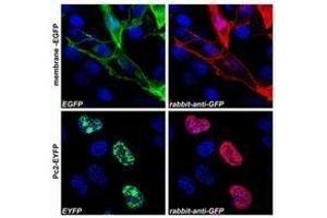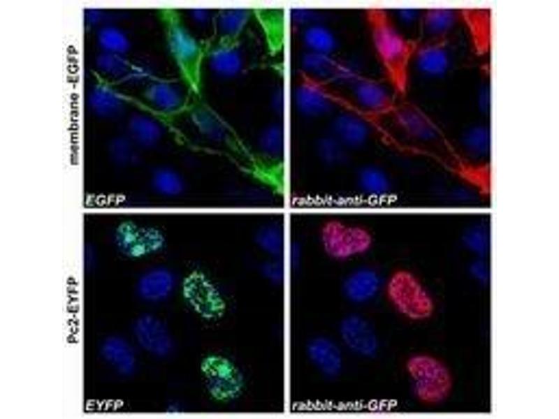 Green fluorescence protein (GFP) is a 27 KDa protein derived from the bioluminiscent jellyfish Aquorea victoria, emiting green light (509 nm) when excited (excitation by Blue or UV light, absorption peak at 395 nm). GFP is a useful tool in cell biology research, as its intrinsic fluorescence can be visualized in living cells. Light-stimulated GFP fluorescence is species-independent and a fluorescence has been reported from many different types of GFP-expressing hosts, including microbes, invertebrates, vertebrates and plants. No exogenous substrates and cofactors are required for the fluorescence of GFP, since GFP autocatalytically forms a fluorescent pigment from natural amino acids present in the nascent protein. GFP fluorescence is stable under fixation conditions and suitable for a variety of applications. GFP is widely used as a reporter (tag) for gene expression, enabling researchers to visualize and localize GFP-tagged proteins within living cells without any further staining. Other applications of GFP include measurement of distance between proteins through fluorescence energy transfer (FRET) protocols. To increase a fluorescence intensity of GFP, chromophore mutations have been created. The Enhanced GFP has a fluorescence 35 times more intense than the wt-GFP. Mutagenesis of GFP has produced also many mutants (e.g. Yellow Fluorescent Protein, Cyan Fluorescent Protein) with warying spectral properties. Antibodies raised against full-length GFP variants should also detect other variants of the protein.Synonyms: GFP-Tag, Green fluorescent protein