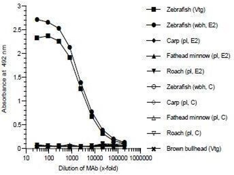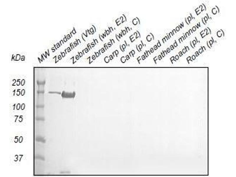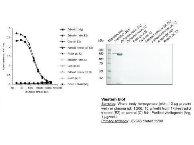 - JE-2A6 binds with high affinity to vitellogenin in whole body homogenate samples from zebrafish. The antibody does not cross-react with vitellogenin from the other cyprinid species carp (Cyprinus carpio), fathead minnow (Pimephales promelas) and roach (Rutilus rutilus).