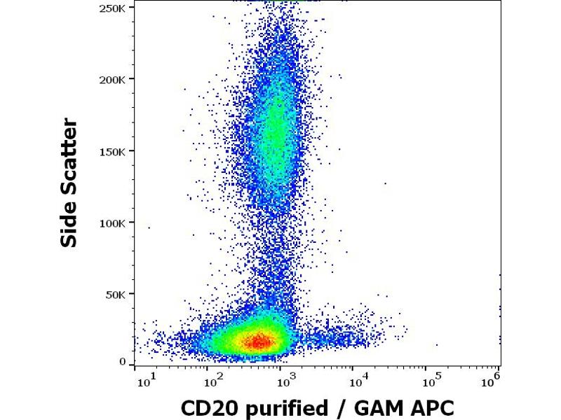 MS4A1,CD20 is a cell surface 33-37 (depending on the degree of phosphorylation) kDa non-glycosylated surface phosphoprotein expressed on mature and most malignant B cells, but not stem cells or plasma cells (low number of the CD20 has been also detected on a subpopulation of T lymphocytes and it can be expressed on follicular dendritic cells). Its expression on B cells is synchronous with the expression of surface IgM. CD20 regulates transmembrane calcium conductance (probably functioning as a component of store-operated calcium channel), cell cycle progression and B-cell proliferation. It is associated with lipid rafts, but the intensity of this association depends on extracellular triggering, employing CD20 conformational change and/or BCR (B cell antigen receptor) aggregation. After the receptor ligation, BCR and CD20 colocalize and then rapidly dissociate before BCR endocytosis, whereas CD20 remains at the cell surface. CD20 serves as a useful target for antibody-mediated therapeutic depletion of B cells, as it is expressed at high levels on most B-cell malignancies, but does not become internalized or shed from the plasma membrane following mAb treatment.,B1, S7, MS4A, Bp35, CVID5, LEU-16