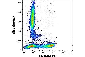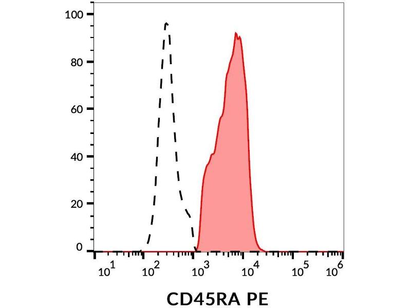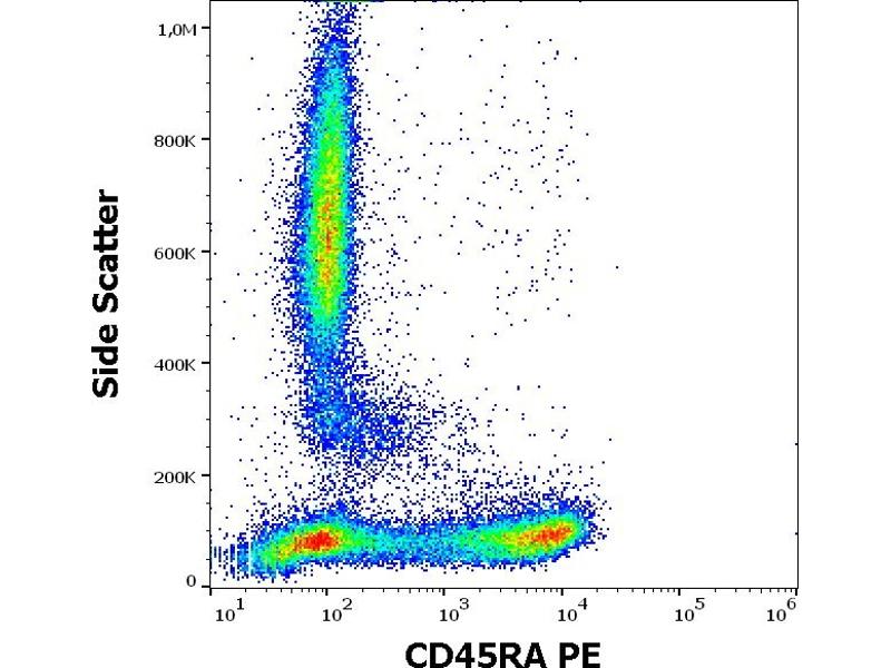 CD45RA is a high molecular weight isoform of a receptor-type protein tyrosine phosphatase, CD45 glycoprotein. CD45 is crucial in lymphocyte development and antigen signaling, serving as an important regulator of Src-family kinases, promotes cell survival by modulating integrin-mediated signal transduction pathway and is also involved in DNA fragmentation during apoptosis. CD45 isoforms differ in their extracellular domains, whereas they share identical transmembrane and cytoplasmic domains. These isoforms differ in their ability to translocate into the glycosphingolipid-enriched membrane domains and their expression depends on cell type and physiological state of the cell. CD45RA is expressed e.g. on naïve T cells and normal plasma cells.,PTPRCR, T200RA