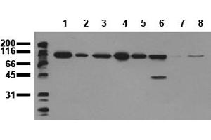ELISA: 0.05 μg/mL. Western Blot: 0.5 μg/mL for HRPO/ECL detection. Recommended blocking buffer: Casein/Tween 20 based blocking and blot incubationbuffer. Immunoprecipitation: 1-10 μg per 10^6 vanadate treated A431 cells. Immunocytochemistry: 0.1-1 μg/mL. Immunohistochemistry on Paraffin Sections. Included Positive Control: Cell lysate from untreated SW480 cells (for details seeProtocols). Other applications not tested. Optimal dilutions are dependent on conditions and should be determined by the user.