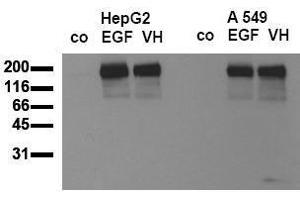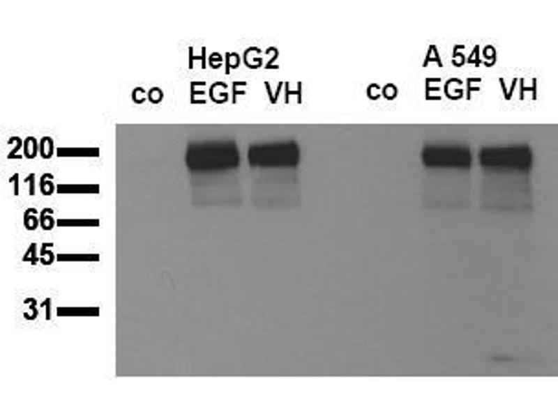 - Positive control cell lysate provided: HepG2 EGF Treated - recommended for immunoblottingFormulation: Lyophilized cell lysate from HepG2 cells. Serum starved cells were treated for 15 min. withEGF. Restore by addition of 200 µl H2O. After complete solubilization add 200 µl 2x SDS-PAGEsample buffer, mix and incubate at 90°C for 5 min. Store in aliquots at -20°C. Avoidrepeated freezing and thawing. Applications: 20 µl of positive cell lysate correspond to ca. 80. 000 cells. Use 20 µl / lane (mini gel) forHRPO/ECL detection of the target proteins.