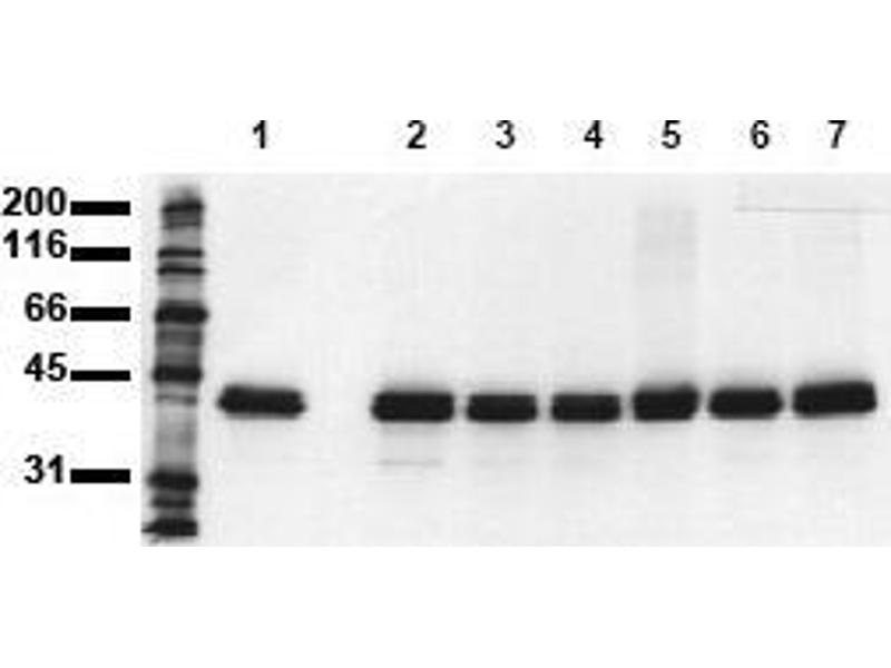 Extracellular signal/mitogen activated protein kinases (erk/MAPK) are a group of proline-directed serine/threonine kinases that are activated by dual phosphorylation of conserved threonine and tyrosine residues within a characteristic T X Y peptide motif. The mitogen-activated kinases erk1 (MAPK1) and erk2 (MAPK2) acquire full enzymatic activity upon phosphorylation of both threonine and tyrosine residues within the sequence motif T E Y.Synonyms: ERT1, Extracellular signal-regulated kinase 2, MAP kinase 2, MAPK1, MAPK2, Mitogen-activated protein kinase 1, PRKM1, PRKM2, p42-MAPK