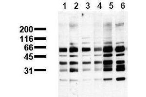 Positive Control: pSer / pThr Molecular Weight MarkerFormulation: The pSer/pThr molecular weight marker contains rabbit muscle phosphoproteins isolatedby Fe3+/IDA - affinity chromatography. Proteins are lyophilized fromPBS/NaF/PEG/Sucrose/ Bromophenolblue and Na - azide. After reconstitution the solutioncontains 0. 09% Na-azide. Stability: Reconstitute by addition of 200 µl H2O. After complete solubilization add 200 µl 2xSDS-PAGE sample buffer, mix and incubate at 90°C for 5 min. Application: The pSer/pThr molecular weight marker is recommended for immunoblot applications. Use20µl molecular weight marker per lane. Note: Use BSA based blot incubation buffers. Milk,Casein and Blotto might interfere with antibody - antigen interaction.