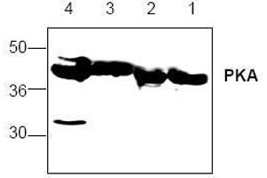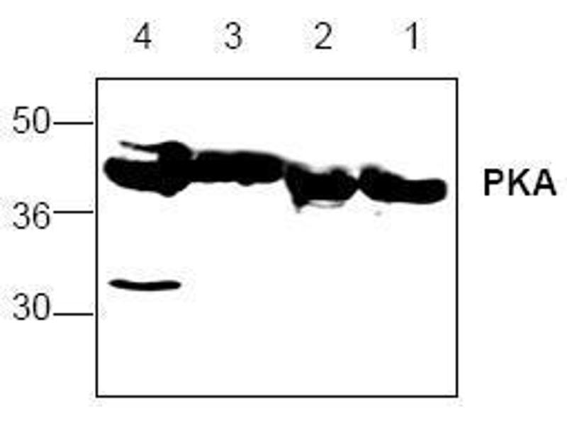 Protein kinase A (PKA) also known as cAMP-dependent protein kinase, is a 40 kDa protein kinase that phosphorylates serine or threonine residues in target proteins in response to elevated levels of cAMP. The second messenger cAMP is produced in response to a wide variety of hormones & neurotransmitters and regulates cellular processes such as cell growth and differentiation, ion channel conductivity, synaptic release of neurotransmitters & gene transcription. The principle intracellular target for cAMP is PKA. Inactive PKA exists as a tetrameric protein composed of two regulatory (R) subunits and two catalytic (C) subunits. Activation occurs when two cAMP molecules bind to each R subunit which causes a conformational change that releases the active C subunits. Two major PKA isozymes, type I (PKAI) and type II (PKAII) consist of RI and RII respectively, complexed with C. Three different C subunits (alpha, beta, and gamma) and four different R subunits (RI-alpha, RI-beta, RII-alpha, and RII-beta) have been identified. It has been suggested that the complex structure of PKA may be necessary for it to accomplish such diverse functions.Synonyms: PKA C-alpha, cAMP-dependent protein kinase catalytic subunit alpha