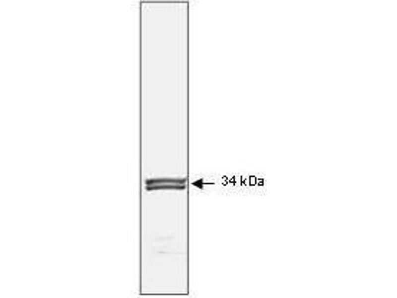 Application Note: Anti-p34 cdc2 has been tested by western blot and is suitable for immunohistochemistry, immunoprecipitation (as active kinase), and immunoblotting. The antibody detects the three bands within the 34kD region corresponding to the p34 protein and its cleavage products. HeLa cell lysate or human colon carcinoma is suggested as a positive control for immunoblotting. LEP fibroblast cell lysate is suggested as a negative control. Paraffin embedded tissue is reactive for immunohistochemistry using high temperature release and 0.1 % saponin treatment or other permeabilization method.