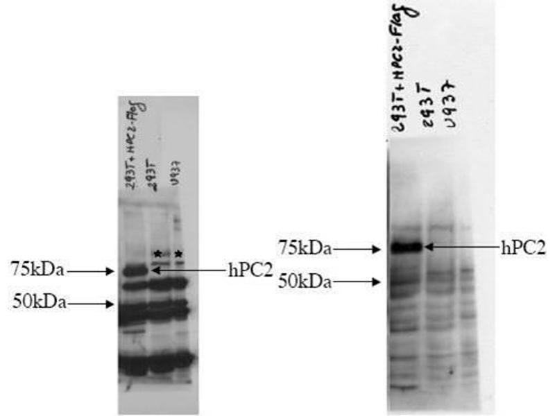 Application Note: Anti-PC2 antibody has been tested for use in ELISA, WB, and IF. This affinity purified antibody is useful in immunofluorescence staining of cultured cells. In immunofluorescence, this antibody detects the expected discrete nuclear structure that is termed the PcG body, corresponding to the known localization of PC2. This affinity purified antibody is useful in western blotting using transfected cell lysates. Dilutions for western blotting represent a starting point dilution and further optimization may be required. The antibody detects a band of approximately 82 kDa (predicted molecular weight: 61.4 kDa). The antibody has been successfully used to detect FLAG-tagged transfected hPC2 (see figure). It detects a weak band that probably corresponds to endogenous PC2, however, a strong secondary band is also seen at 50kD in all cell lines thus far tested. This suggests that the antibody may also react with another highly expressed ubiquitous protein. Reactivity in other immunoassays is unknown.