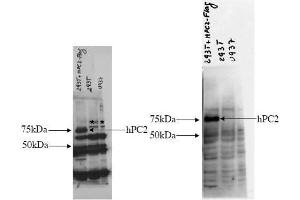 Immunogen: This affinity purified antibody was prepared from whole rabbit serum produced by repeated immunizations with a synthetic peptide corresponding to an internal region near aa 90-115 of Human PC2 protein.