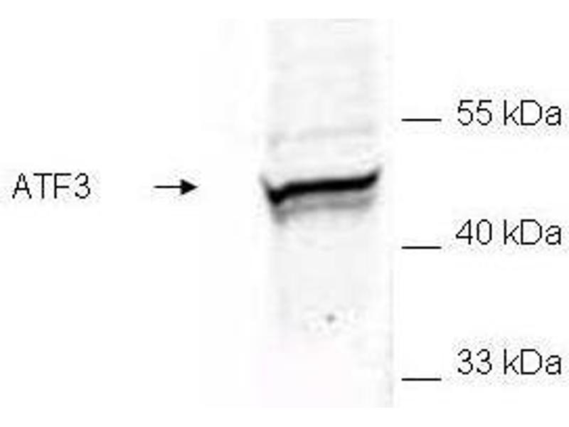 Immunogen: This antibody was prepared from whole rabbit serum produced by repeated immunizations with a synthetic peptide corresponding to an internal region of human ATF3.