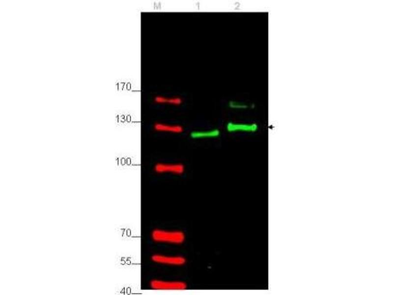 Application Note: This antibody has been tested for use in ELISA, immunohistochemistry and western blot. Specific conditions for reactivity should be optimized by the end user. See figure legend for expectations by western blot. Multiple splice variants have been reported for this protein a, b, g and d (133.3, 131.6, 88.1 and 86.4 kDa respectively). Detection of Gli-2 by western blot may be enhanced if nuclear extracts are used instead of whole cell lysates as the expression/abundance of Gli-2 is likely to be low. Furthermore, Gli-2 expression is likely to be developmentally regulated and induced, making it difficult to detect in whole tissue homogenates.
