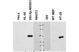 - Background: This antibody is designed, produced, and validated as part of a collaboration with the National Cancer Institute (NCI) and is suitable for Cancer, Immunology and Nuclear Signaling research. The enzymes NADPH oxidase (NOX) and dual oxidase (DUOX) generate ROS in a regulated manner, producing reactive oxygen in various cells and tissues in response to growth factors, cytokines and calcium signals. The oxidase consists of the catalytic subunit gp91phox (otherwise known as NOX2), together with the regulatory subunits p22phox, p47phox, p40phox, p67phox and the small GTPase RAC. The enzyme activity of gp91phox is regulated by the assembly of these regulatory subunits with gp91phox to form an active complex. In 1999, the first of the NOX homologues of gp91phox was described as NOX1. The enzyme was cloned from a colon epithelial cell complementary DNA library. When expressed in cells, NOX1 generated low amounts of ROS, but high-level ROS production by NOX1 was subsequently achieved by co-expression with novel regulatory subunits (described later). Subsequently, NOX3 and NOX4 were cloned, and the latter was shown to generate high levels of ROS when expressed in cells. NOX organizer 1 (NOXO1) is a homologue of p47phox and has an almost identical domain organization, except that it lacks the auto-inhibitory region. NOX activator 1 (NOXA1) is a homologue of p67phox and similarly shares the same domain organization, except that it lacks one of the two SH3 domains that are present in p67phox. Co-transfection of NOX1, NOXO1 and NOXA1 results in marked ROS generation. Similar to p47phox, NOXO1 binds to p22phox, which is required for NOX1-dependent activity. NOXA1 has a well-conserved activation domain, implying a conserved mechanism for regulating the activity of the target NOX enzyme.