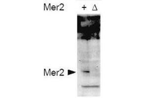 Immunogen: This affinity purified antibody was prepared from whole rabbit serum produced by repeated immunizations with a synthetic peptide corresponding to amino acids 26-35 of Saccharomyces cerevisiae Mer2 protein.
