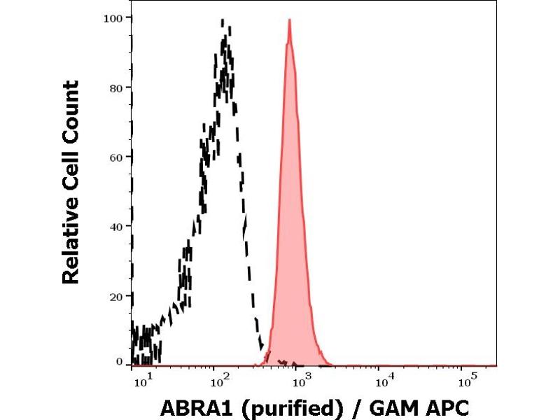 The mouse monoclonal antibody ABRA1-01 recognizes human ABRA1 (Abraxas, CCDC98), an adaptor protein involved in DNA repair, which migrates as a 45 kDa band on PAAGE under reducing conditions.
