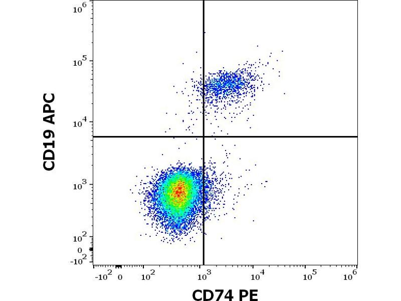 The antibody LN2 recognizes an extracellular epitope of CD74 (the MHC II-associated invariant chain, Ii), a type II transmembrane protein expressed in antigen-presenting cells, as well as e.g. on activated neoplastic cells in T cell lymphomas, in lymph node germinal center, mantle zone B cells, histiocytes, interdigitating reticulum cells, Langerhans cells, thymic dendritic cells and peripheral blood B lymphocytes.