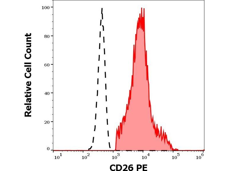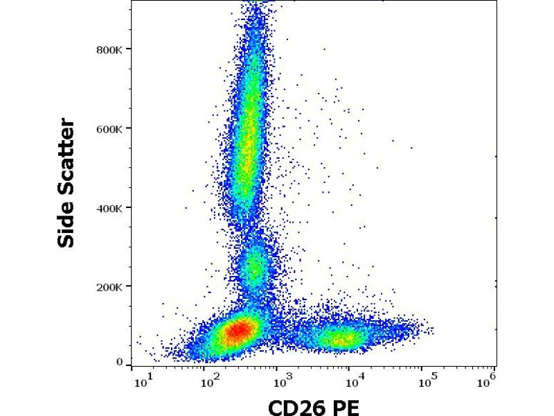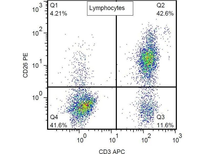 The mouse monoclonal antibody BA5b recognizes an extracellular epitope of CD26, a 110 kDa type II transmembrane glycoprotein, which is a peptidase expressed on mature thymocytes, T cells (especially activated), B cells, NK cells and macrophages.