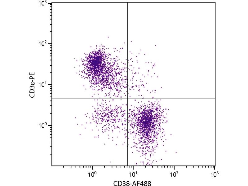 - Murine CD38, a type II transmembrane glycoprotein, is a bifunctional ectoenzyme capable of catabolizing nicotinamide adenine dinucleotide (NAD+) to cyclic ADP-ribose (cADPR), and then hydrolyzing cADPR to adenosine diphosphoribose (ADPR). It is expressed at high levels on the surface of peripheral B-lineage cells, and at low density on germinal center B cells from unimmunized mice. It has also been reported to be expressed at moderate levels on NK cells, a proportion of peripheral T cells, and a subpopulation of thymocytes which are mostly TCR+, CD4-, CD8-. Murine CD38 is also expressed by all Mac-1+ macrophages in the peritoneal cavities of unimmunized mice, but not by unstimulated bone-marrow-derived macrophages. Monoclonal antibodies to CD38 have been shown to induce B- and T-cell proliferation, protect B cells from apoptosis, and inhibit B lymphopoiesis.