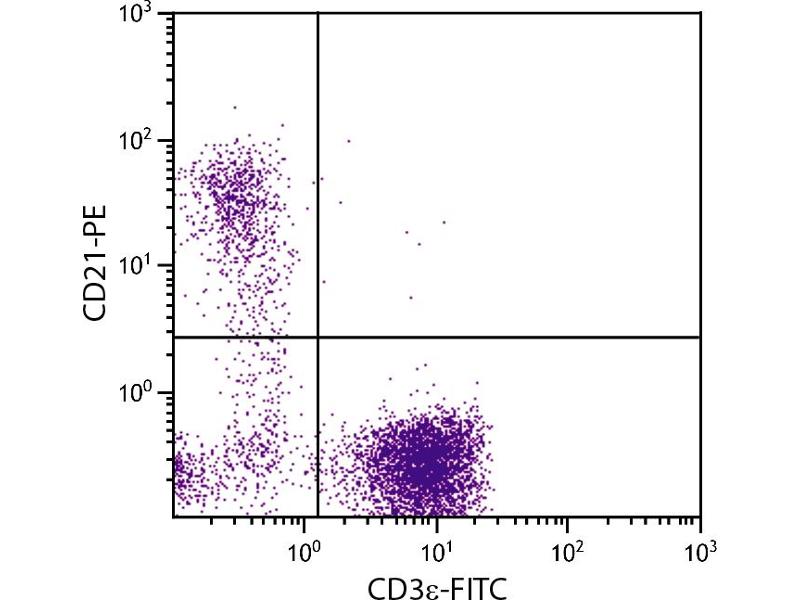 CD21, also known as complement receptor 2, is expressed on all mature circulating B lymphocytes but not on T lymphocytes or natural killer cells. Low density CD21 has also been reported on granulocytes and monocytes.