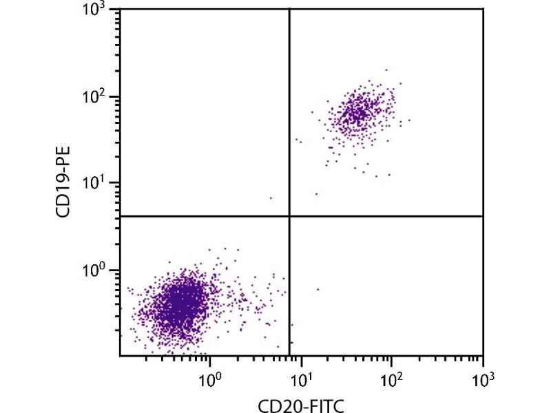 CD20 is a 33-37 kDa unglycosylated phosphoprotein. Although not a member of the tetraspanin superfamily of cell surface receptors, it crosses the cell membrane four times. It is expressed on all stages of B cell differentiation except plasma cells. The CD20 molecule is involved in regulation of B cell differentiation, presumably via its reported function as a Ca++ channel subunit.