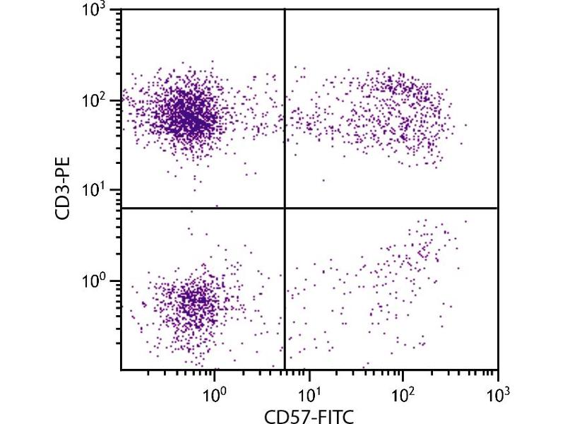 CD57 represents a 100 kDa oligosaccharide antigenic determinant present on a variety of polypeptides, lipids and chondroitan sulfate proteoglycans. It is expressed on 7-35 % of normal peripheral blood lymphocytes, including subsets of NK cells and CD8+ T lymphocytes. The function of CD57 is unknown.