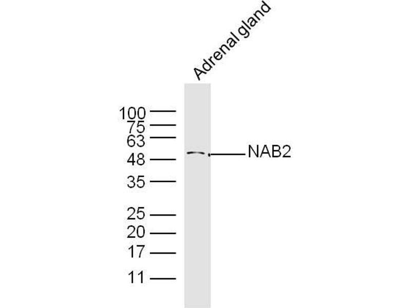 Background: Transcriptional control is in part regulated by interactions between DNA-bound transcription factors, such as Egr-1/NGFI-A, and coregulatory proteins, such as NAB (for NGFI-A-binding proteins). The evolutionarily conserved NAB proteins, NAB1 and NAB2 are corepressors of EGF-1/NGFI-A. Both NAB1 and NAB2 contain an amino terminal NAB conserved domain 1 (NCB1), which is required for binding NGFI-A, and a carboxy terminal NCD2 domain, which is responsible for the repressor function of NAB proteins. NAB2 is principally localized in the nucleus and may play a role in the downregulation of NGFI-A activity as well as in controlling fundamental processes such as cell division, differentiation and apoptosis. NAB2 localizes to chromosome 12q13.3-14.1, a region that is rearranged in several solid tumors, lipomas, and liposarcomas.