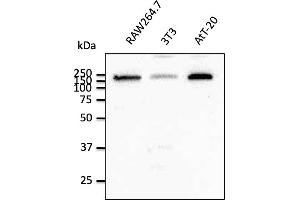 - Detects a band of 180 kDa by Western blot in the following human, mouse and rat whole cell lysates.