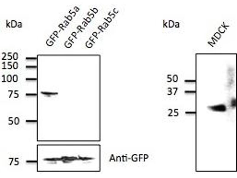 - Detects Rab5a protein by Western blot in cell lysates of transfected cells with GFP-Rab5a. This Ab is specific for Rab5a, it does not recognize Rab5b and Rab5c.