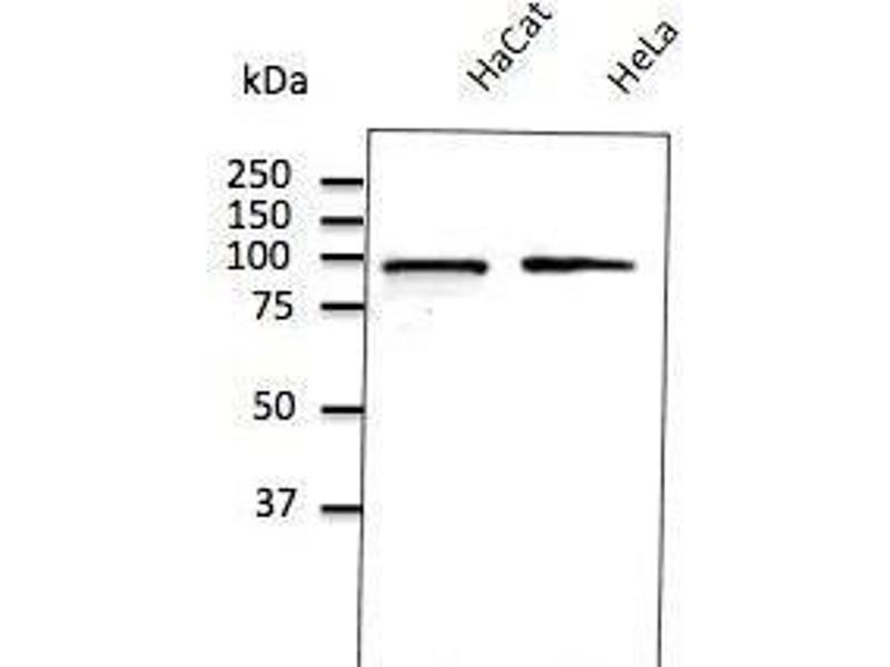 - Detects a band of 90 kDa by Western blot in the following human (293A, primary fibroblasts, HaCat, HeLa, HMEC-1, Jurkat, MNT1, U-118, rat (TR-iBRB), mouse (3T3, AtT-20, Hepa, Raw264.7), monkey (COS-7) and canine (D17) whole cell lysates.
