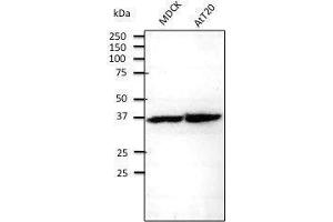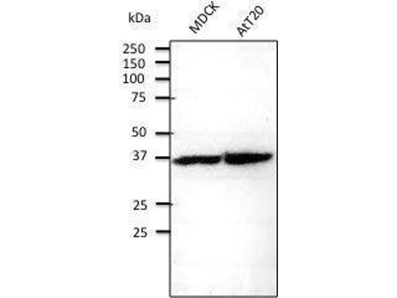 - Detects a band of approximately 30 kDa by Western blot in the following whole cell lysates: MDCK, AtT20, Jurkat and 3T3.