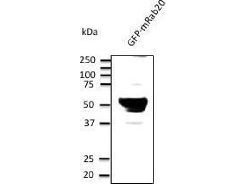 - Detects Rab20 in transfected cells with GFP-Rab20 by Western blot.