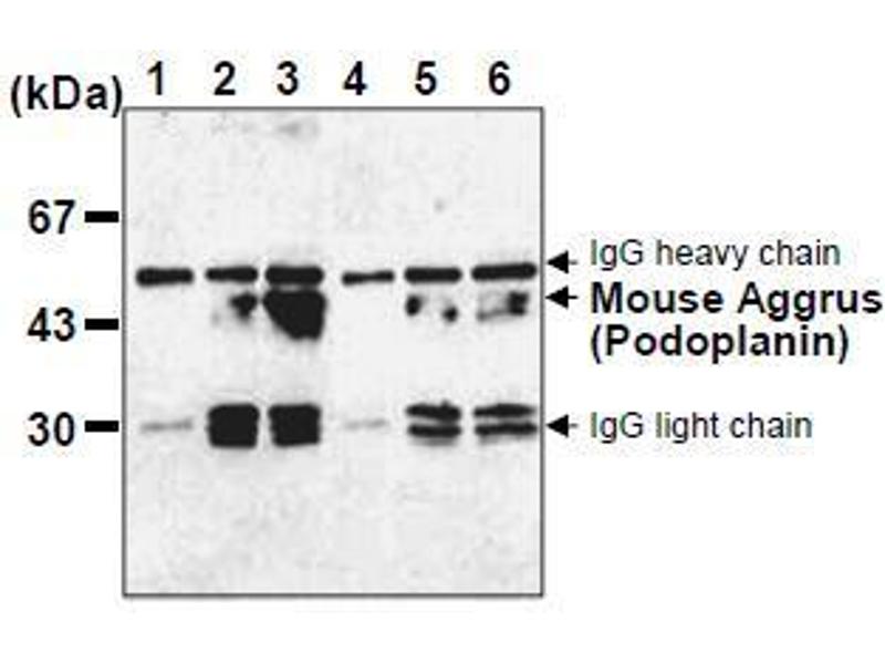 In addition to hemostasis and host defense, platelets are involved in the induction of inflammation, tissue repair, and tumor metastasis. Aggrus (T1a/Podoplanin) is a novel 36-45 kDa membrane sialoglycoprotein that induces platelet aggregation. Aggrus is highly expressed in various tumor cells and the platelet aggregation ability of Aggrus depends on specific oligosaccharide structures that may be related to the metastasis process in cancer cells. Aggrus has been identified as a diagnostic tumor marker for seminomas and testicular cancers.Synonyms: Aggrus, GP36, Glycoprotein 36, PA2.26 antigen, PDPN, PSEC0003, PSEC0025, T1-alpha