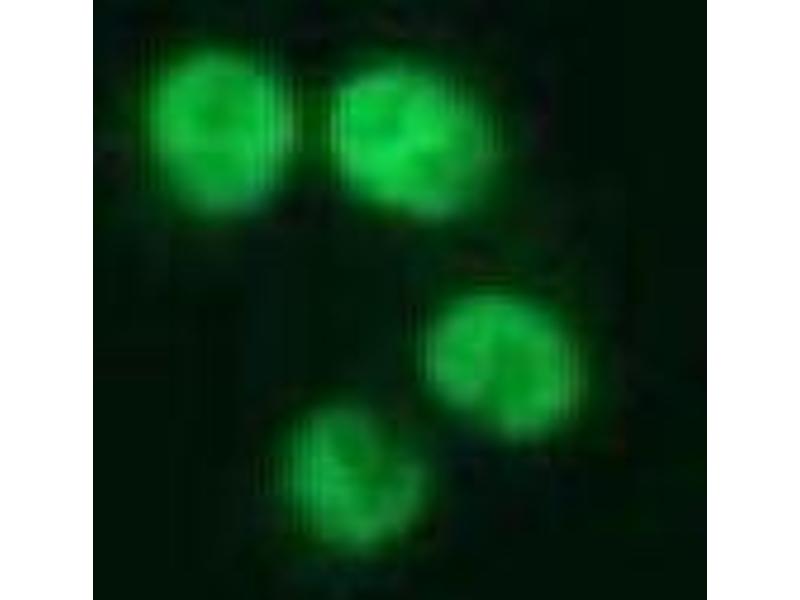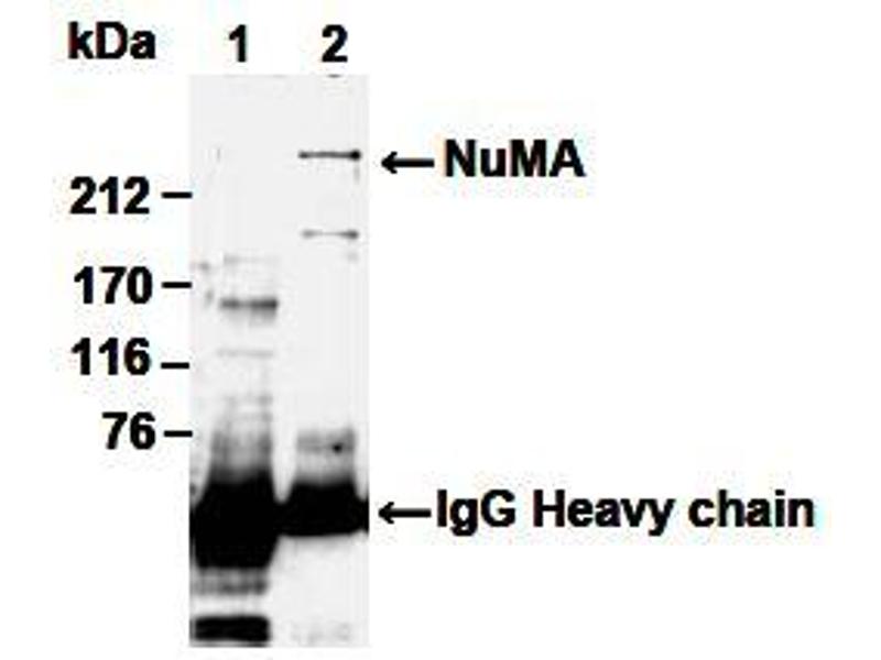 NuMA (Nuclear Mitotic Apparatus Protein) is involved in maintenance of nuclear structure and in the assembly of the mitotic spindle. During interphase, NuMA is present throughout the nucleus, and during mitosis, it localizes to the spindle. It associates with microtubule motors during mitosis, and plays an essential role in anchoring microtubule ends to the spindle poles. NuMA is an autoantigen, and some individuals with connective tissue disease or other autoimmune disorders have antibodies directed against the NuMA protein. Recent data suggests NuMA (240 kDa) is cleaved to a 180-200 kDa form during apoptosis.Synonyms: NUMA1, Nuclear mitotic apparatus protein 1, SP-H antigen