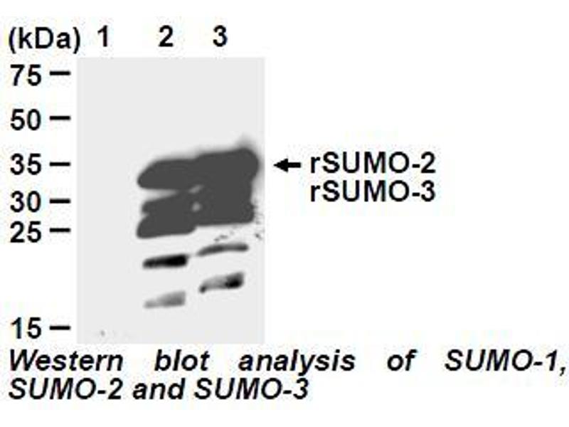 Sumoylation, the covalent attachment of a small ubiquitin-like modifier (SUMO) peptide to lysine residues of targeted substrate, has recently emerged as an important mechanism in transcriptional control. In humans and mice, the SUMO family consists of three members, SUMO-1, -2, and -3. SUMO-2 (SMT3A, Sentrin-3) and SUMO-3 (SMT3B, Sentrin-2) are similar (~95 % identical), but less closely related to SUMO-1 (~50 % identical). Whereas many proteins modified by SUMO-1 were identified, many as yet unidentified proteins are modified by SUMO-2/3 after exposure of cells to various stress stimuli.Synonyms: HSMT3, SMT3 homolog 2, SMT3A, SMT3H2, SUMO-3, Sentrin-2, Small ubiquitin-related modifier 2, Smt3A, Ubiquitin-like protein SMT3A