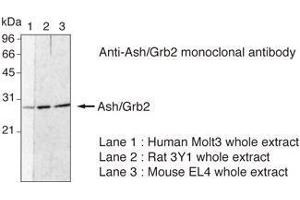 - Grb2 (Growth factor receptor bound protein 2) also known as Ash, is a 25-28 kDa molecule composed of central Src homology (SH2) domain and SH3 domains. Grb2 associates with tyrosine phosphorylated proteins such as EGFR, PDGFR, IRS-1, Shc and Gab1 via its Sh2 domain. The SH3 domain of Grb2 binds to Sos, which stimulates the GTP binding activity of Ras, cause activation of MAP kinase and other signaling pathways. Grb2 is an adaptor protein, which does not have enzymatic activity itself. Grb2 express ubiquitously and has two isoforms.Synonyms: Growth factor receptor-bound protein 2